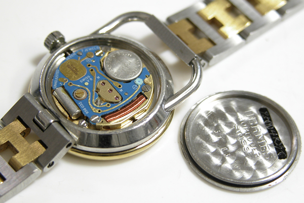 ムーブメント拡大。金色の電池押さえのリード板の収まる位置がずれております。