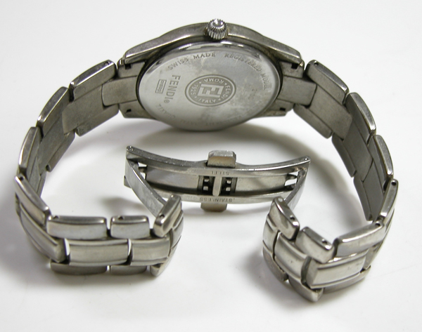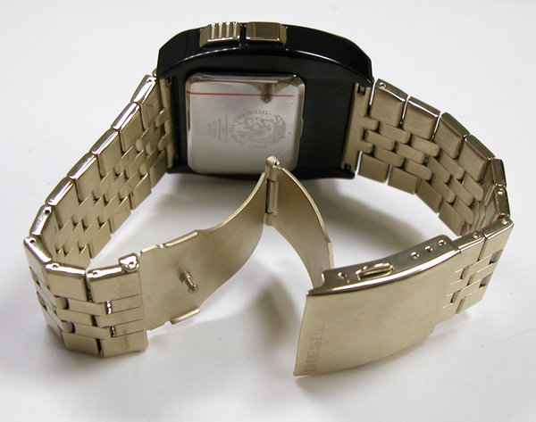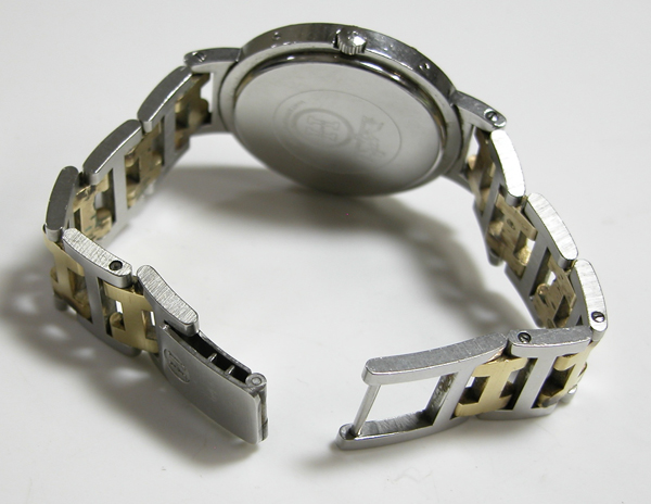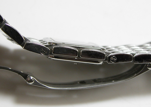 ステンレス無垢バンドに両開きバックル。