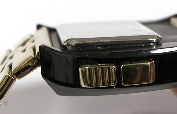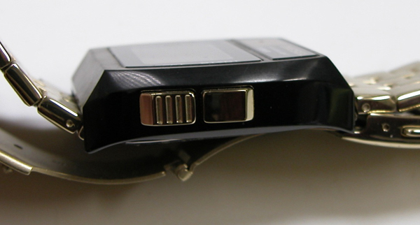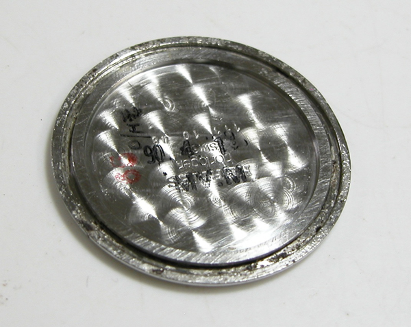 裏蓋は4本ネジで留まっていて裏蓋記載。裏蓋上のプッシュボタンが竜頭の代わり。