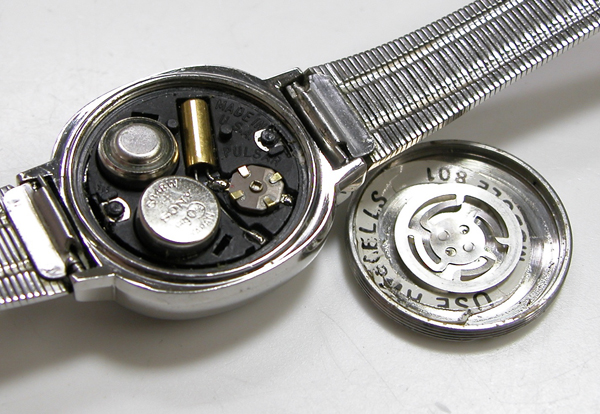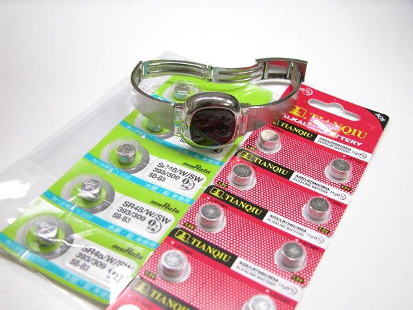 今回「電池を同梱」という事で到着致しました。互換性のある電池も送るので動作するかテストも宜しくお願いいたします。という事で、どちらも同じ電池ですがこの時計に使われるのは2個。左のMurataの電池は私も普段使っているので問題無いでしょうから、今回は赤い台紙の方を使いましょう。