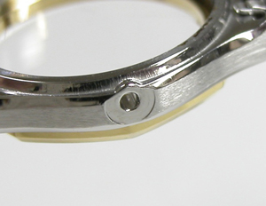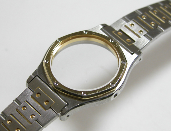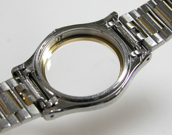 ステンレス板巻きバンドに三つ折れバックル。見た目は綺麗ですが隙間には埃が多く。
