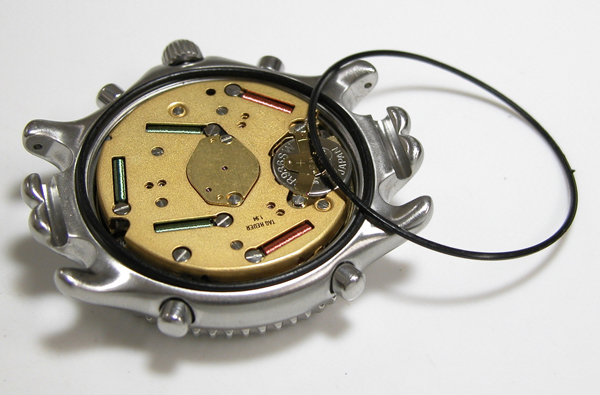 一応、パッキンは交換してシリコン塗布をしてケースに戻します。ただ竜頭を替えないと防水機能は安心出来ない状態です。