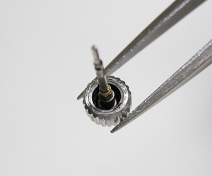 ムーブメント側のレバーが押しても戻りません。金属疲労で曲がっております。引き出してみますが折れそうなので、触る事は断念。
