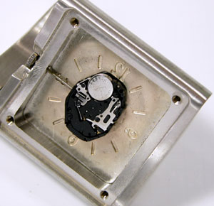 裏蓋はネジ留め。 ここに竜頭が見えますので中は腕時計のムーブ。