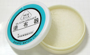 竜頭にもシリコンを塗ります。 竜頭の”クォーツ・マーク”が懐かしいですね。