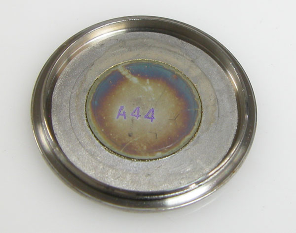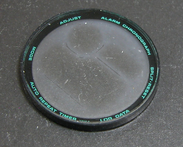 ケースの汚れもチェックして。ブルーの液が流れた痕跡が見えますが。湿気で文字盤か、ガラスのプリントが色落ちした痕跡です。この症状は初めて見ました。