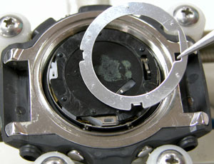 次にラバーのスペーサーを摘み出して。やっとムーブメントが見えます。