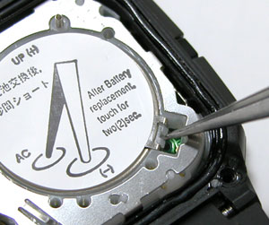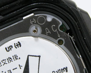 これがAC端子。↓で示してあるから分かりやすいです。デジタル腕時計は電池交換の後"AC端子”と電池のプラス側をショートさせて腕時計をリセットします。リセットをした後は必ず時間表示されているか確認してください。表示がされていない場合はリセット作業をやり直してください。