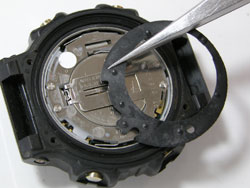 ムーブメントにはまったくダメージはありません。さすがG。これは綿棒で簡単に拭き取る事が出来ました。スペーサーは摘み出すのみ。