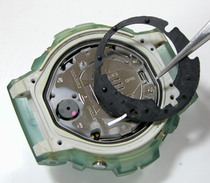 裏蓋にパッキンが付いて出てきます。ゴムのスペーサーが見えますから。