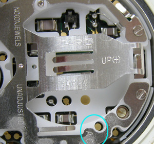 これが裏蓋記載。裏蓋をベルトが覆っておりますから外さないと電池交換の作業に入れません。