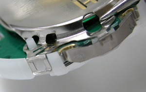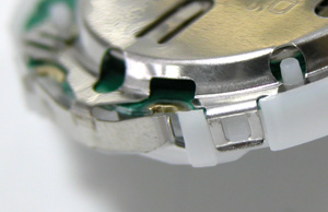 これが電池押さえをムーブメントに固定する爪。それが全て電池押さえと一体になっております。つまりムーブメントをケースに入れたまま電池交換は不可能で完全に取り出す必要があります。