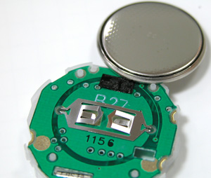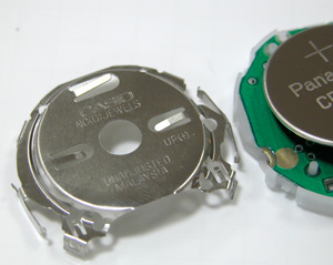 押さえを外せば電池むき出し。そして電池を外してムーブメントを横向けると、マイナス端子の金属はポロリと落ちます。