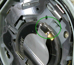 電池を固定している金属板の片方は腕時計のムーブメントの一部として繋がっております。片方は”爪を掛けてある”のみですからピンセットを差し込んで手前に起こせば簡単に外れます。電池交換後は指で押さえれば簡単に留まります。この状況で取り出しが可能です。