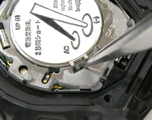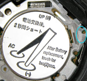 デジタル腕時計は電池交換の後"AC端子”と電池のプラス側をショートさせて腕時計をリセットします。リセットをした後は必ず時間表示されているか確認してください。表示がされていない場合はリセット作業をやり直してください。