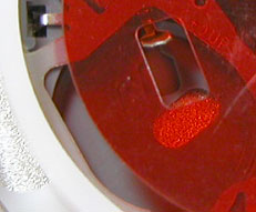 蓋を開けるとリチュウム電池が入っておりますが、詰め3カ所で留まっておりますから、コジあげるのみ。 電池を外すと「赤い絶縁紙」フィルムが見えます。しかしこの○の所、かなり不自然です。