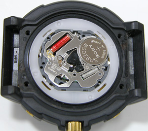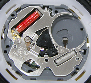 これがムーブメント。電池格納部をチェックして電池を入れて完了です。