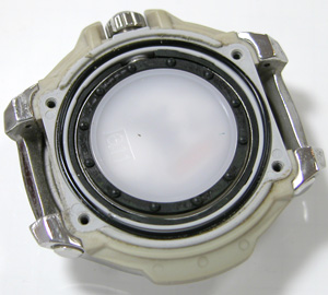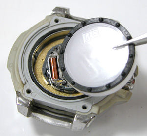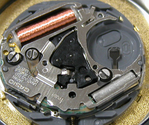 これがムーブメント。電池格納部をチェックして電池交換。全体の重厚なデザインの割には質素なムーブメント。これがクォーツ時計の世界ですか。