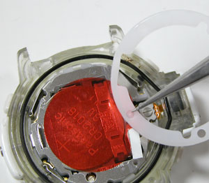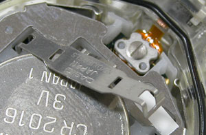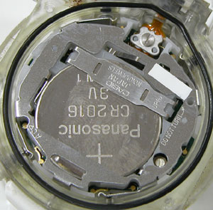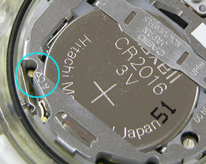 電池の押さえが単独のタイプですからカシオでも古いタイプ。爪で引っかけてあるのみ。