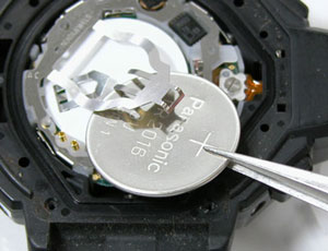 カシオ腕時計(CASIO)プロトレック/1571電池交換続きです。写真では電池を金属のピンセットで摘んでおりますが、撮影の都合上であって実際には電池の出し入れはプラスチックのピンセットで作業します。