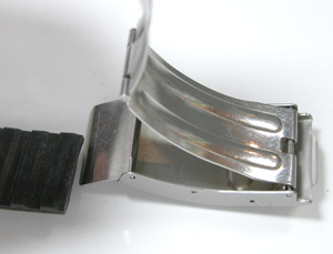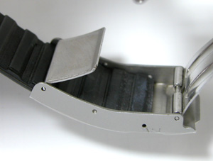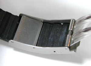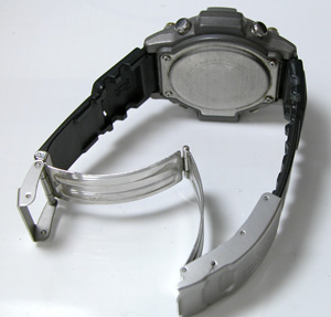 電池交換の為にバックルを開きますが、Dバックルタイプ。このバックル裏側の金属の板を。
