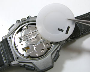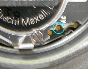 この位置から工具を差し込みます。電池を固定している金属板の片方は腕時計のムーブメントの一部として繋がっております。片方は”爪を掛けてある”のみですからピンセットを差し込んで手前に起こせば簡単に外れます。電池交換後は指で押さえれば簡単に留まります。この状況で取り出しが可能です。
