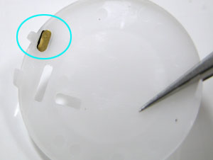これがAC端子。スペーサーの裏蓋に金属端子が見えますから、こういったタイプはスペーサーを戻すときに向きに注意が必要です。