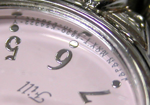 ピンクの文字盤にシルバーのインデックスが綺麗に映えます。写真・右は文字盤キャリバー。