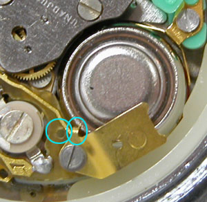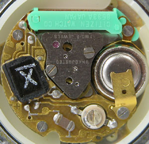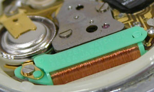 このグリーンのプラスチックはコイルを触らない様にカバーしてあります。電池が裏向き入ってるタイプ。このムーブメントは電池は”SR41SW”。右の○の爪が左の○の穴に入っております。