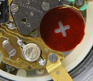 この赤いフィルムの中央は”×”ではありません。”+”の意味です。プリント基板むき出しのレトロなクォーツムーブメントの紹介でした。