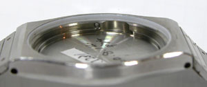 こういった構造のケースを「ワンピース・ケース」と言おります。文字盤を下にして机に置くと針が曲がってしまおりますが、この様にガラスとベゼルの上にのせてやればOKです。