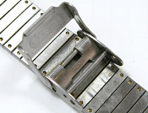 綺麗なムーブメントです。後は今までの行程を辿って組み立てれば完了。ついでですから、この腕時計のバックルを紹介。この写真では分かりにくいのですがスライド式です。