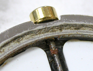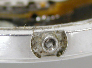 そして竜頭パッキンの劣化で巻芯から汗が入ります。白いスペーサーを外すと1時位置のインデックス周りの文字盤裏側が錆びております。明らかにガラス面から湿気の侵入ですね。