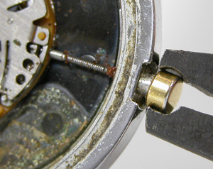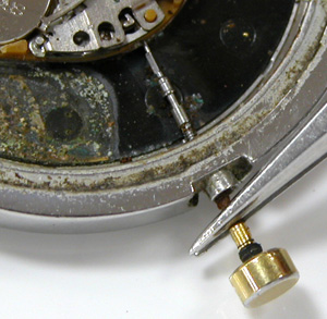 竜頭パイプもチェックします。これが取り出した文字盤&ムーブメント。