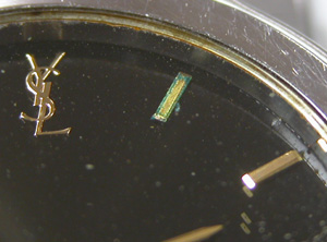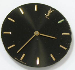 YSL 9620-H13821電池交換です。一見綺麗な腕時計ですが。”1時位置”のインデックスが錆びております。文字盤上のサビは殆どの場合ガラスからの湿気が入った為です。