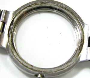 これが開けたところですが、裏蓋とケースの接触面がビッシリ汚れております。想像ですがこの腕時計すでに5・6回は電池交換されているでしょう。でも過去の電池交換の時に一度もケースの掃除がされていないのです。