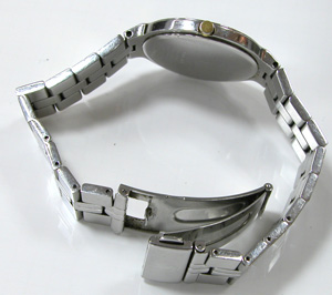ステンレス無垢バンドに三つ折れプッシュバックル。裏蓋は”はめ込みタイプ”で裏蓋周辺は綺麗に掃除されております。