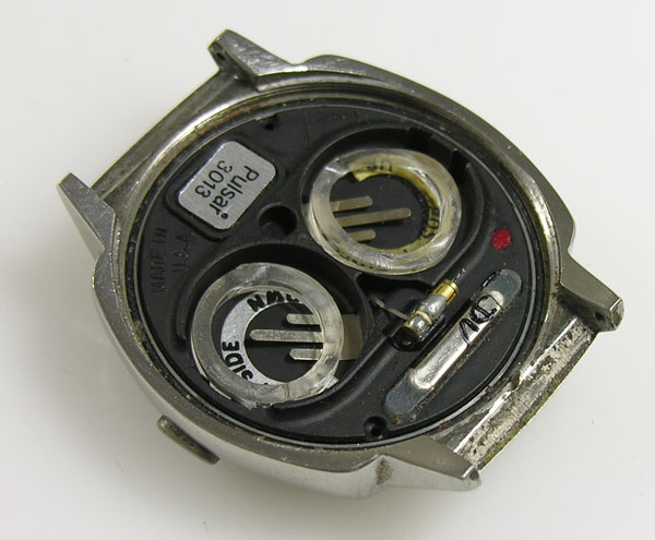 これがムーブメントですがサビも無く異常は感じられません。電池のスペーサー代わりのゴムが収まっております。