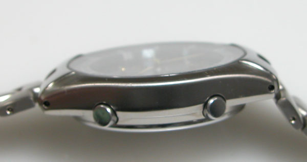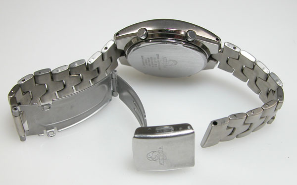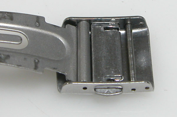 ステンレス無垢バンドに三つ折れプッシュバックル。