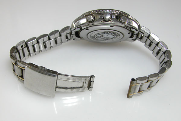 ステンレス無垢バンドに三つ折れプッシュバックル。