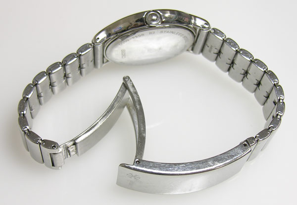 ステンレス無垢バンドに三つ折れバックル。