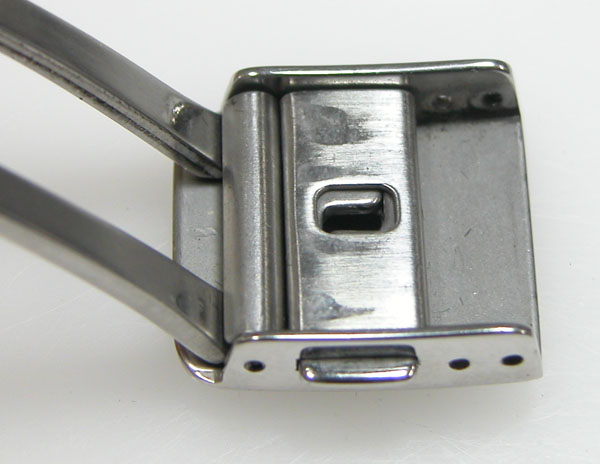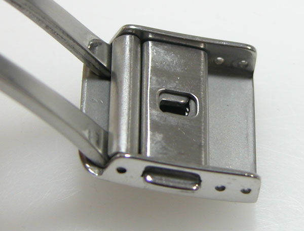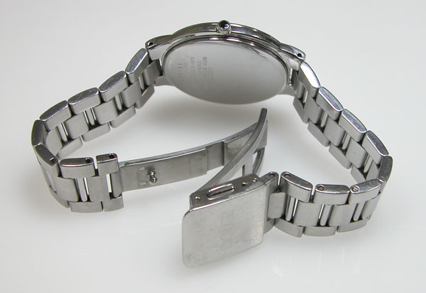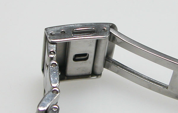 ステンレス無垢バンドに三つ折れプッシュバックル。