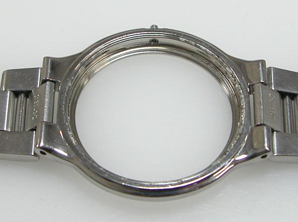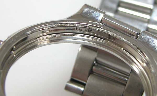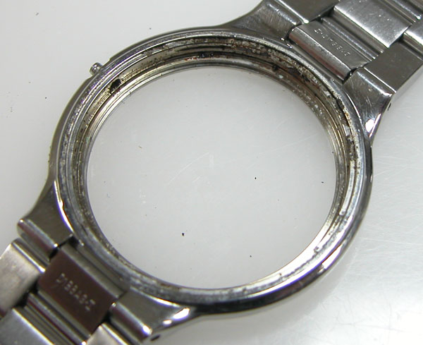 ケースの内側もチェックして。ケースもサビが凄いですがガラス側と、裏蓋側の両方からの浸水の痕跡があります。