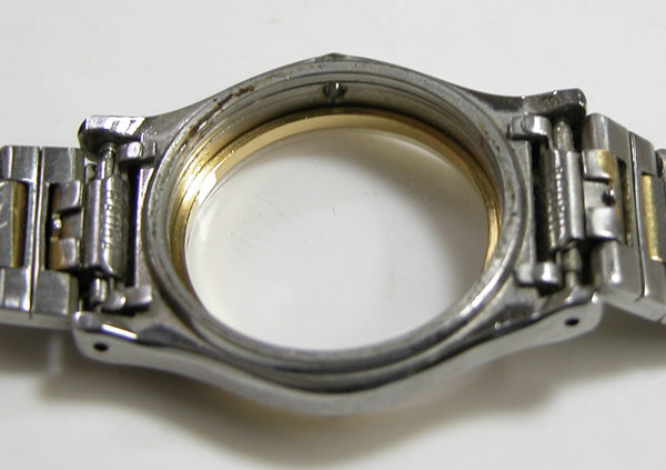 ステンレス板巻きバンドに三つ折れバックル。見た目は綺麗ですが隙間には埃が多く。