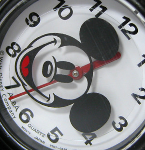 この腕時計は秒針が無いように見えますが、良く見るとミッキーの顔が