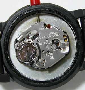 これがムーブメント、EPSONですが。ここでおや?ムーブメントがスカスカ。