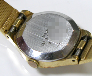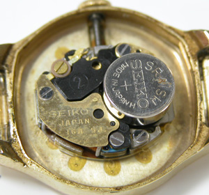 マイナス端子で電池が浮き上がっております。裏蓋の形状もレトロなクォーツ。