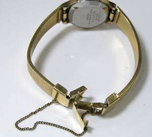 クォーツマークが書いてあるのも懐かしい。ベルトはカット式ブレスレット。切りすぎては元に戻せないタイプ。