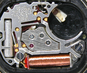 これがムーブメント。そこそこの値段の腕時計ですが・・・・確かにムーブメントはSEIKO CORPですから良いのですが・・。他のエクセリーヌにも良く入っているのですね・・・。(v_v)