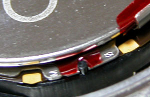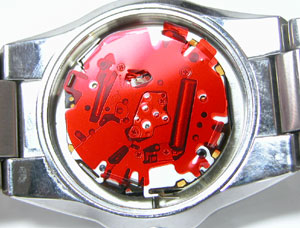 絶縁フィルムも一緒に外すのですが、一緒に外れた試しがありません。電池を外した後で絶縁フィルムのみ外します。これがムーブメント。